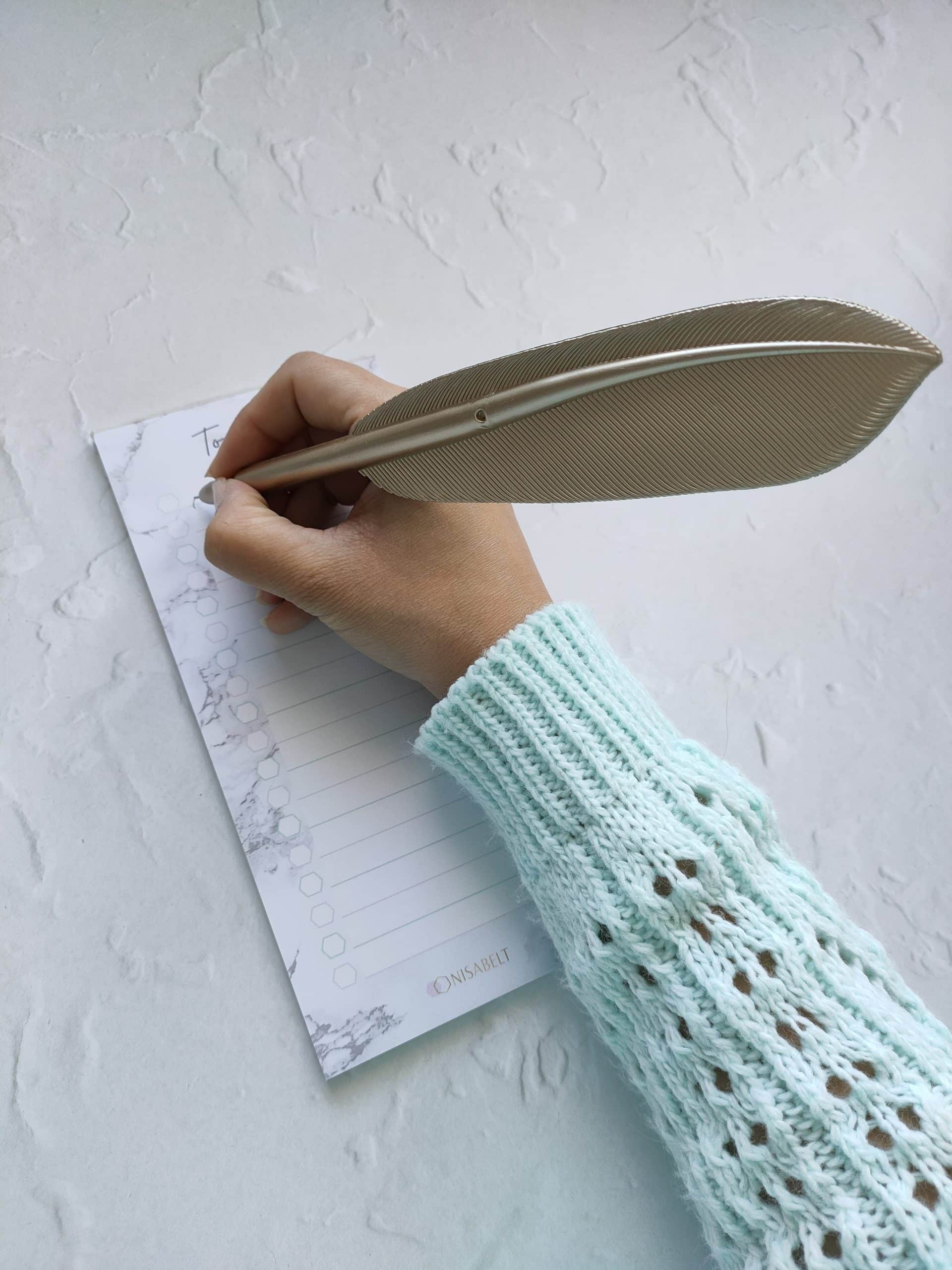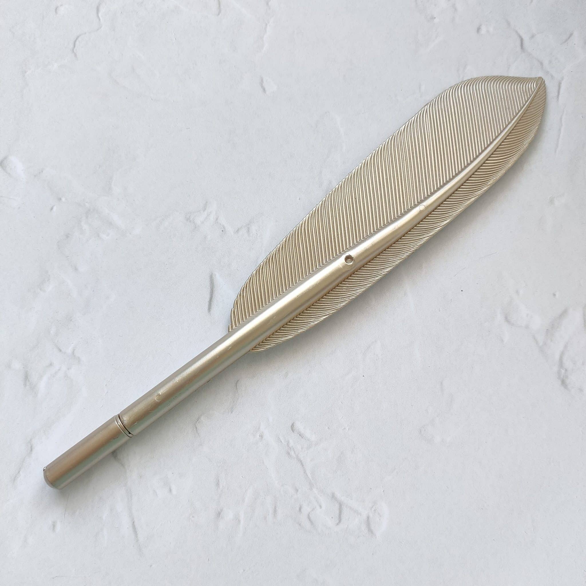Bolígrafo de punta fina con forma de pluma y exterior en dorado.